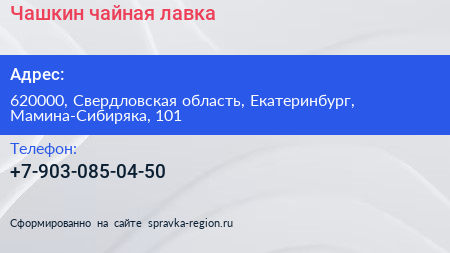 Чашкин, чайная лавка по адресу 620000, Свердловская область, Екатеринбург, Мамина-Сибиряка, 101 в дальнейшем Организация, размещена в следующих категориях: