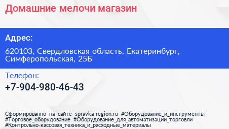 Домашние мелочи, магазин по адресу 620103, Свердловская область, Екатеринбург, Симферопольская, 25Б в дальнейшем Организация, размещена в следующих категориях: