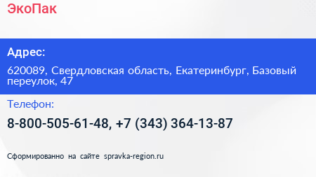 ЭкоПак по адресу 620089, Свердловская область, Екатеринбург, Базовый переулок, 47 в дальнейшем Организация, размещена в следующих категориях: