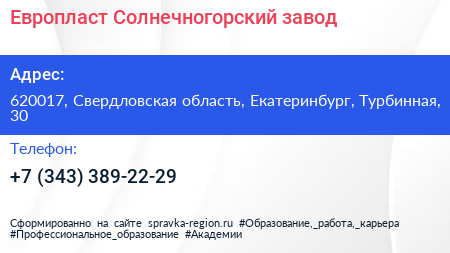 Европласт, Солнечногорский завод по адресу 620017, Свердловская область, Екатеринбург, Турбинная, 30 в дальнейшем Организация, размещена в следующих категориях: