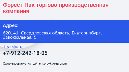 Форест-Пак, торгово-производственная компания по адресу 620141, Свердловская область, Екатеринбург, Завокзальная, 5 в дальнейшем Организация, размещена в следующих категориях: