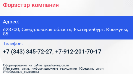 Форэстэр, компания по адресу 623700, Свердловская область, Екатеринбург, Коммуны, 85 в дальнейшем Организация, размещена в следующих категориях: