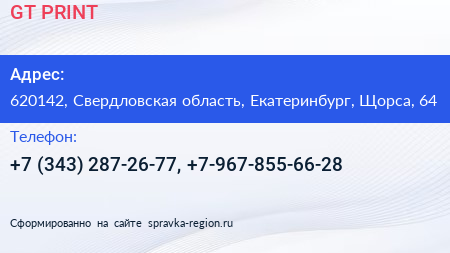 GT PRINT по адресу 620142, Свердловская область, Екатеринбург, Щорса, 64 в дальнейшем Организация, размещена в следующих категориях: