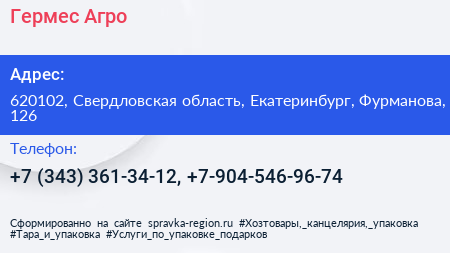 Гермес-Агро по адресу 620102, Свердловская область, Екатеринбург, Фурманова, 126 в дальнейшем Организация, размещена в следующих категориях: