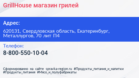 GrillHouse, магазин грилей по адресу 620131, Свердловская область, Екатеринбург, Металлургов, 70 лит П4 в дальнейшем Организация, размещена в следующих категориях: