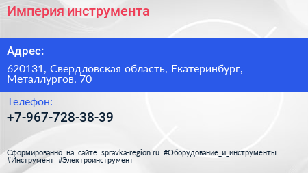 Империя инструмента по адресу 620131, Свердловская область, Екатеринбург, Металлургов, 70 в дальнейшем Организация, размещена в следующих категориях: