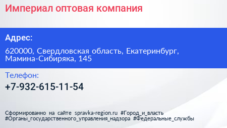 Империал, оптовая компания по адресу 620000, Свердловская область, Екатеринбург, Мамина-Сибиряка, 145 в дальнейшем Организация, размещена в следующих категориях: