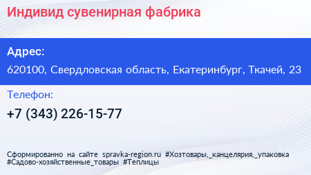 Индивид, сувенирная фабрика по адресу 620100, Свердловская область, Екатеринбург, Ткачей, 23 в дальнейшем Организация, размещена в следующих категориях: