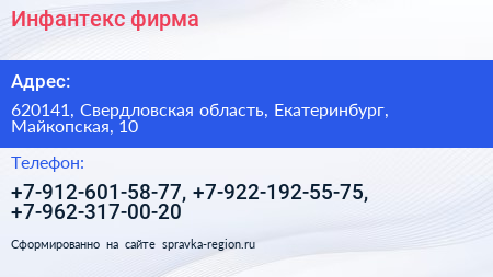 Инфантекс, фирма по адресу 620141, Свердловская область, Екатеринбург, Майкопская, 10 в дальнейшем Организация, размещена в следующих категориях:
