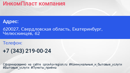 ИнкомПласт, компания по адресу 620027, Свердловская область, Екатеринбург, Челюскинцев, 62 в дальнейшем Организация, размещена в следующих категориях: