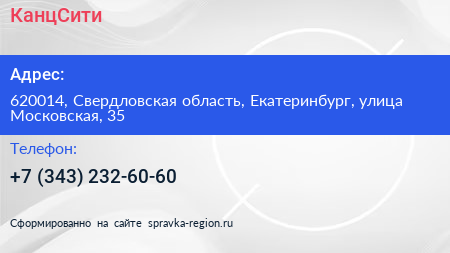 КанцСити по адресу 620014, Свердловская область, Екатеринбург, улица Московская, 35 в дальнейшем Организация, размещена в следующих категориях: