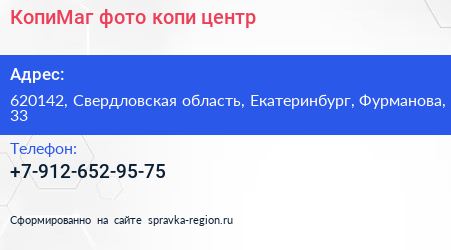 КопиМаг, фото-копи центр по адресу 620142, Свердловская область, Екатеринбург, Фурманова, 33 в дальнейшем Организация, размещена в следующих категориях: