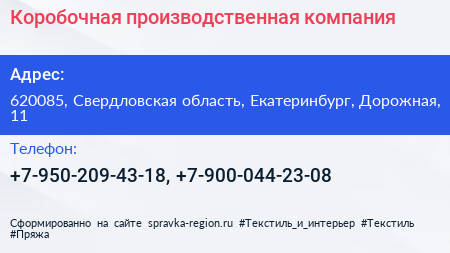 Коробочная, производственная компания по адресу 620085, Свердловская область, Екатеринбург, Дорожная, 11 в дальнейшем Организация, размещена в следующих категориях: