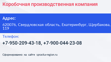 Коробочная, производственная компания по адресу 620076, Свердловская область, Екатеринбург, Щербакова, 119 в дальнейшем Организация, размещена в следующих категориях: