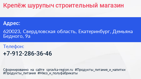 Крепёж-шурупыч, строительный магазин по адресу 620023, Свердловская область, Екатеринбург, Демьяна Бедного, 9а в дальнейшем Организация, размещена в следующих категориях: