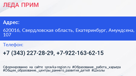 ЛЕДА-ПРИМ по адресу 620016, Свердловская область, Екатеринбург, Амундсена, 107 в дальнейшем Организация, размещена в следующих категориях: