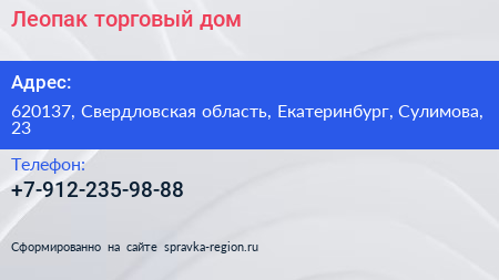 Леопак, торговый дом по адресу 620137, Свердловская область, Екатеринбург, Сулимова, 23 в дальнейшем Организация, размещена в следующих категориях: