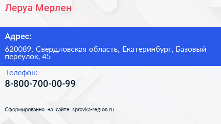 Леруа Мерлен по адресу 620089, Свердловская область, Екатеринбург, Базовый переулок, 45 в дальнейшем Организация, размещена в следующих категориях: