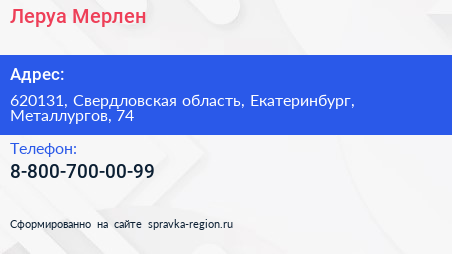 Леруа Мерлен по адресу 620131, Свердловская область, Екатеринбург, Металлургов, 74 в дальнейшем Организация, размещена в следующих категориях: