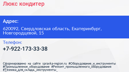 Люкс кондитер по адресу 620092, Свердловская область, Екатеринбург, Новгородцевой, 15 в дальнейшем Организация, размещена в следующих категориях: