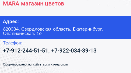MARA, магазин цветов по адресу 620034, Свердловская область, Екатеринбург, Опалихинская, 16 в дальнейшем Организация, размещена в следующих категориях: