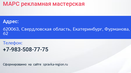 МАРС, рекламная мастерская по адресу 620063, Свердловская область, Екатеринбург, Фурманова, 62 в дальнейшем Организация, размещена в следующих категориях: