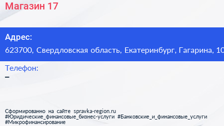 Магазин №17 по адресу 623700, Свердловская область, Екатеринбург, Гагарина, 10 в дальнейшем Организация, размещена в следующих категориях: