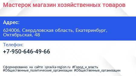 Мастерок, магазин хозяйственных товаров по адресу 624006, Свердловская область, Екатеринбург, Октябрьская, 48 в дальнейшем Организация, размещена в следующих категориях: