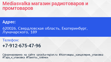 Mediasvalka, магазин радиотоваров и промтоваров по адресу 620026, Свердловская область, Екатеринбург, Луначарского, 189 в дальнейшем Организация, размещена в следующих категориях: