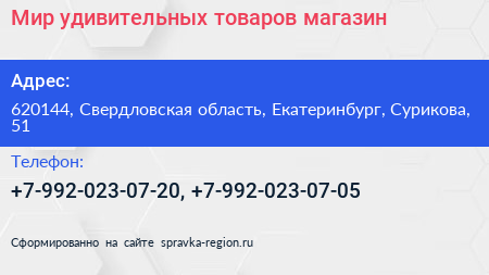 Мир удивительных товаров, магазин по адресу 620144, Свердловская область, Екатеринбург, Сурикова, 51 в дальнейшем Организация, размещена в следующих категориях: