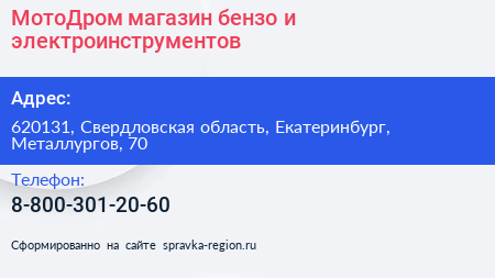 МотоДром, магазин бензо и электроинструментов по адресу 620131, Свердловская область, Екатеринбург, Металлургов, 70 в дальнейшем Организация, размещена в следующих категориях: