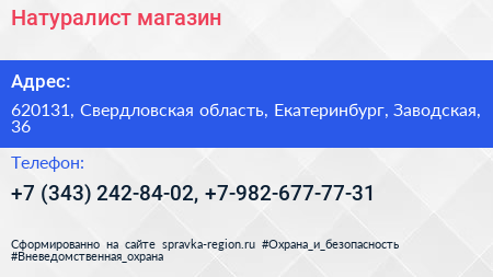Натуралист, магазин по адресу 620131, Свердловская область, Екатеринбург, Заводская, 36 в дальнейшем Организация, размещена в следующих категориях: