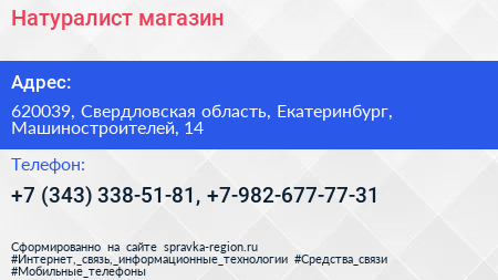 Натуралист, магазин по адресу 620039, Свердловская область, Екатеринбург, Машиностроителей, 14 в дальнейшем Организация, размещена в следующих категориях: