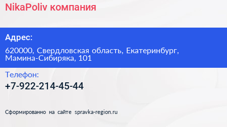 NikaPoliv, компания по адресу 620000, Свердловская область, Екатеринбург, Мамина-Сибиряка, 101 в дальнейшем Организация, размещена в следующих категориях: