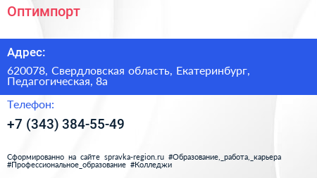 Оптимпорт по адресу 620078, Свердловская область, Екатеринбург, Педагогическая, 8а в дальнейшем Организация, размещена в следующих категориях: