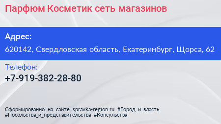 Парфюм Косметик, сеть магазинов по адресу 620142, Свердловская область, Екатеринбург, Щорса, 62 в дальнейшем Организация, размещена в следующих категориях: