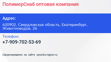 ПолимерСнаб, оптовая компания по адресу 620902, Свердловская область, Екатеринбург, Животноводов, 26 в дальнейшем Организация, размещена в следующих категориях: