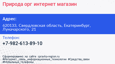 Природа.орг, интернет-магазин по адресу 620133, Свердловская область, Екатеринбург, Луначарского, 21 в дальнейшем Организация, размещена в следующих категориях: