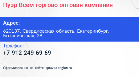 Пуэр Всем, торгово-оптовая компания по адресу 620137, Свердловская область, Екатеринбург, Ботаническая, 28 в дальнейшем Организация, размещена в следующих категориях: