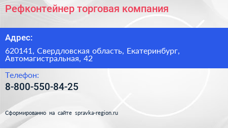 Рефконтейнер, торговая компания по адресу 620141, Свердловская область, Екатеринбург, Автомагистральная, 42 в дальнейшем Организация, размещена в следующих категориях: