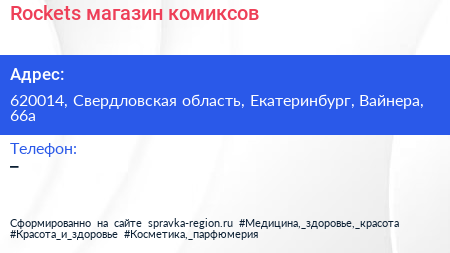 Rockets, магазин комиксов по адресу 620014, Свердловская область, Екатеринбург, Вайнера, 66а в дальнейшем Организация, размещена в следующих категориях: