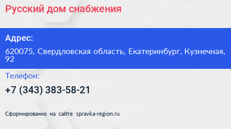 Русский дом снабжения по адресу 620075, Свердловская область, Екатеринбург, Кузнечная, 92 в дальнейшем Организация, размещена в следующих категориях: