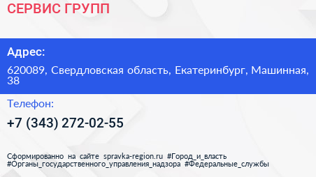 СЕРВИС ГРУПП по адресу 620089, Свердловская область, Екатеринбург, Машинная, 38 в дальнейшем Организация, размещена в следующих категориях: