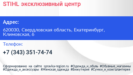 STIHL, эксклюзивный центр по адресу 620030, Свердловская область, Екатеринбург, Климовская, 6 в дальнейшем Организация, размещена в следующих категориях: