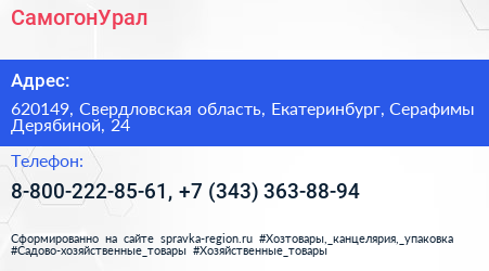 СамогонУрал по адресу 620149, Свердловская область, Екатеринбург, Серафимы Дерябиной, 24 в дальнейшем Организация, размещена в следующих категориях: