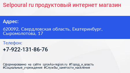 Selpoural.ru, продуктовый интернет-магазин по адресу 620092, Свердловская область, Екатеринбург, Сыромолотова, 17 в дальнейшем Организация, размещена в следующих категориях: