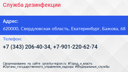 Служба дезинфекции по адресу 620000, Свердловская область, Екатеринбург, Бажова, 68 в дальнейшем Организация, размещена в следующих категориях: