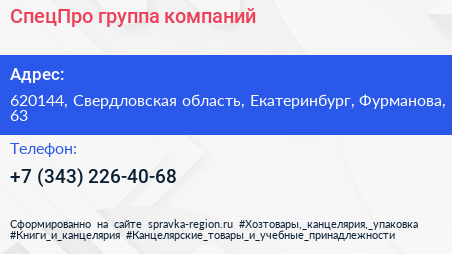 СпецПро, группа компаний по адресу 620144, Свердловская область, Екатеринбург, Фурманова, 63 в дальнейшем Организация, размещена в следующих категориях: