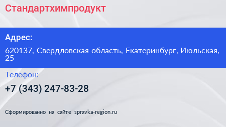 Стандартхимпродукт по адресу 620137, Свердловская область, Екатеринбург, Июльская, 25 в дальнейшем Организация, размещена в следующих категориях:
