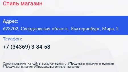 Стиль, магазин по адресу 623702, Свердловская область, Екатеринбург, Мира, 2 в дальнейшем Организация, размещена в следующих категориях: